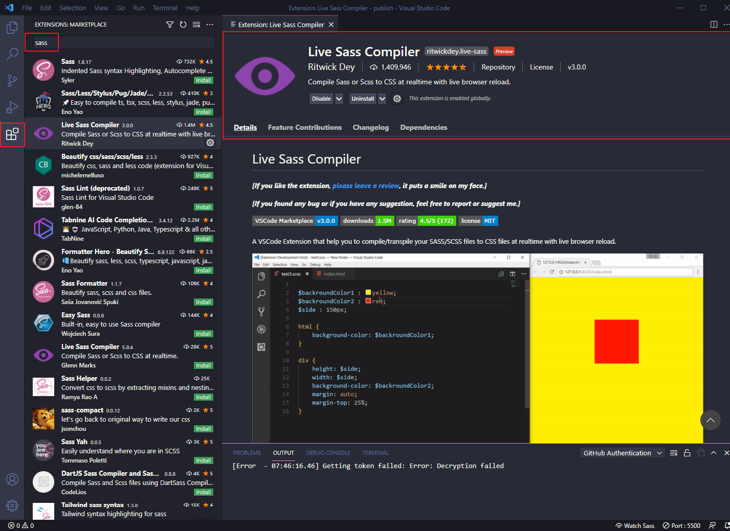 VSCode๋ฅผ ์ด๊ณ ํ์ฅํ๋ก๊ทธ๋จ ๋ค์ด๋ก๋ํ๋ ๊ณณ์์ sass๋ฅผ ๊ฒ์ํ๋ฉด ๋ํ๋ฉ๋๋ค.
