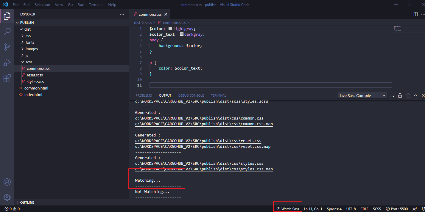 ๊ทธ๋ฆฌ๊ณ ์ฐ์ธก ํ๋จ์ Watch Sass๋ฅผ ํด๋ฆญํ๋ฉด ์ค์๊ฐ์ผ๋ก ์ปดํ์ผ์ด ๋ฉ๋๋ค.